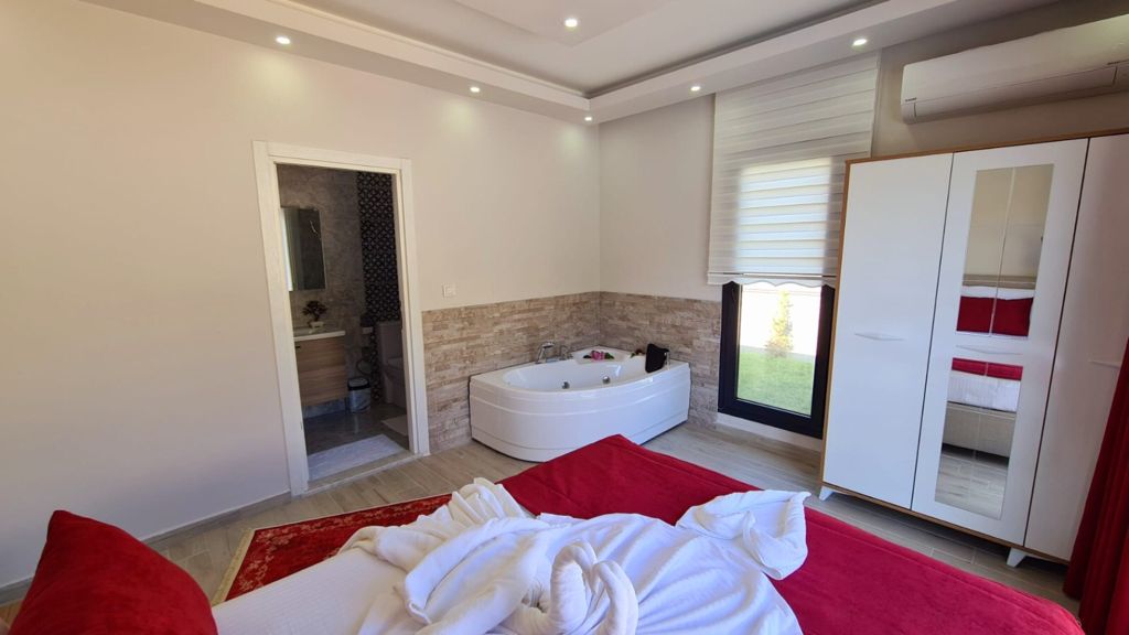 1. Yatak Odası: 1 Çift Kişilik Yatak + Elbise Dolabı + Komodin + Klima + Jakuzi + Ebeveyn Banyo