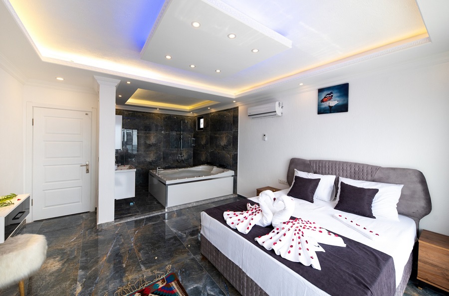 1.Yatak Odası: 1 çift kişilik yatak, klima, jakuzi, TV, banyo,
