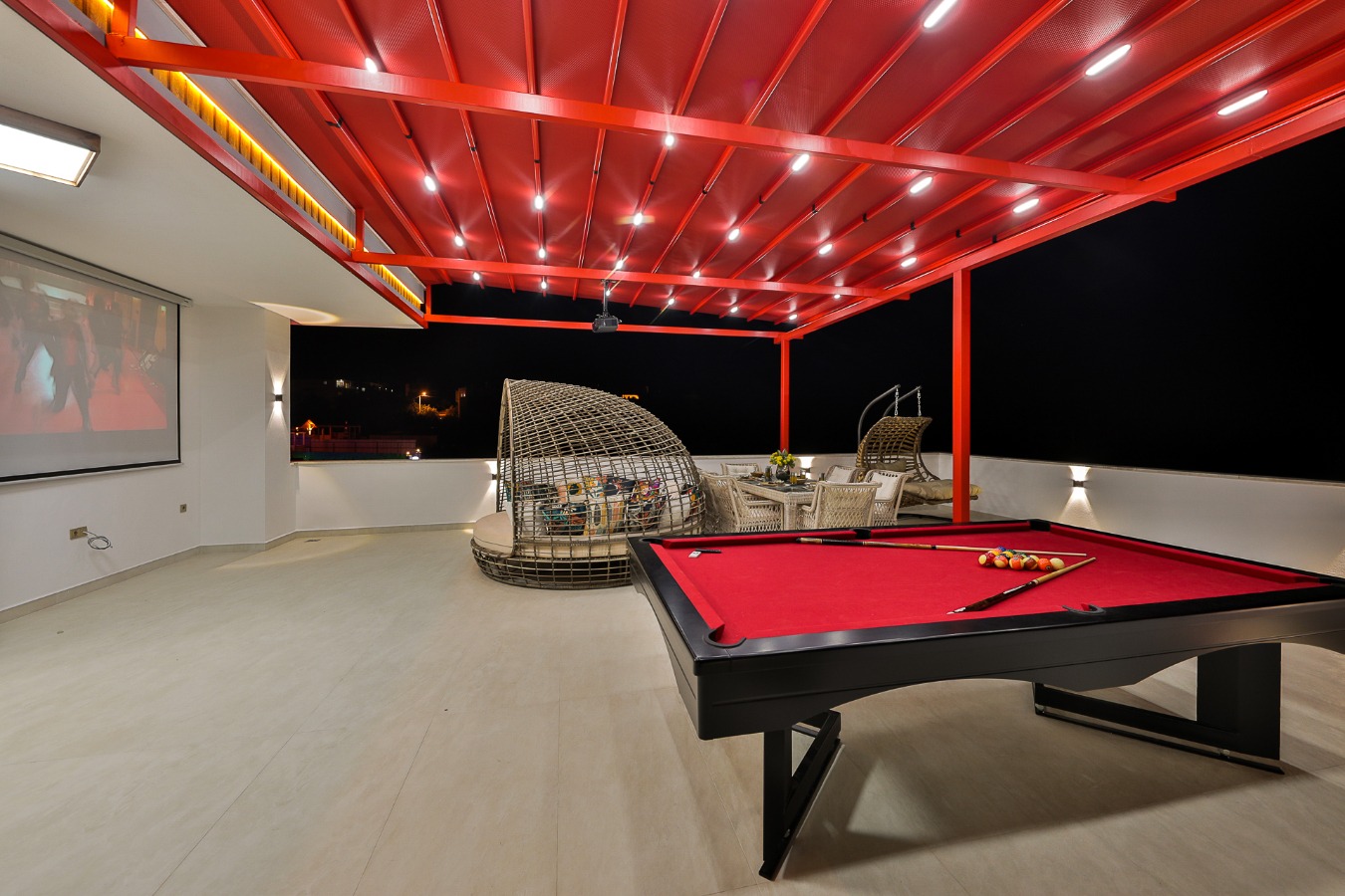 Salon: Oturma gurubu, klima, LCD ve uydu alıcısı, tv ses sistemi, havuz başına ve bahçeye çıkış vardır.